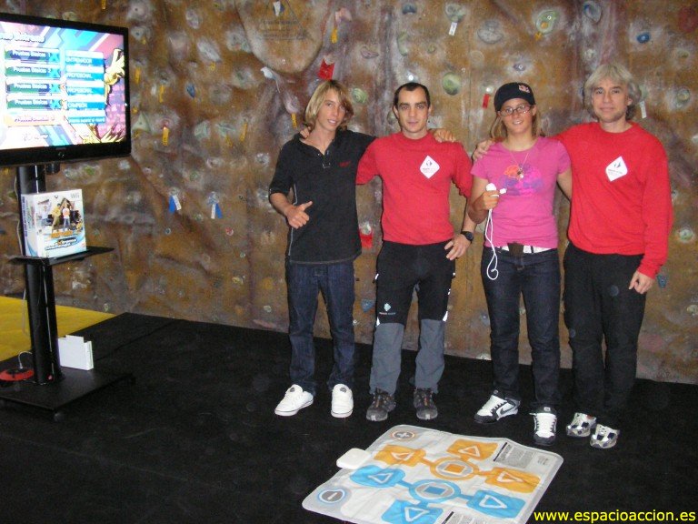 Técnicos de Espacio Acción experimentan la escalada virtual con el nuevo juego Demostración real de escalada a cargo de Álvaro Duque (Espacio Acción) Gisela Pulido y Forest Bakker, con Álvaro Duque y Joaquín Colorado (centro y derecha), de Espacio Acción, al término del evento